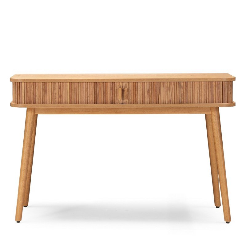 Biroul Clemente combină designul modern cu caracterul practic. Marginile sale rotunjite, picioarele înalte și un dulap cu uși glisante din stejar, împodobite cu șipci decorative, creează un spațiu elegant și funcțional pentru depozitarea accesoriilor de birou. Picioarele robuste din lemn masiv de hevea subliniază pe deplin calitatea înaltă și stilul biroului Clemente.