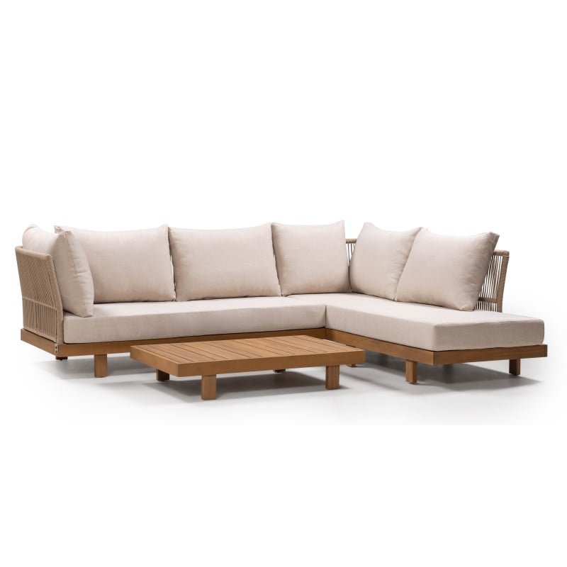 Canapeaua noastră de colț de grădină Borgetto, cea mai bine vândută, combină durabilitatea lemnului de salcâm și a construcției din aluminiu cu un aspect de design. Spătarul țesut manual, realizat din frânghie rezistentă, adaugă o notă unică, iar pernele și măsuța incluse asigură un confort excepțional.