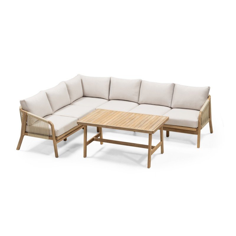 Canapea de colț de grădină Castello cu masă, împletitură din răchită, lemn de salcâm FSC, aspect de tec, bej