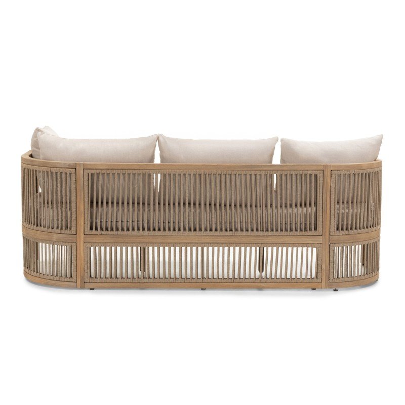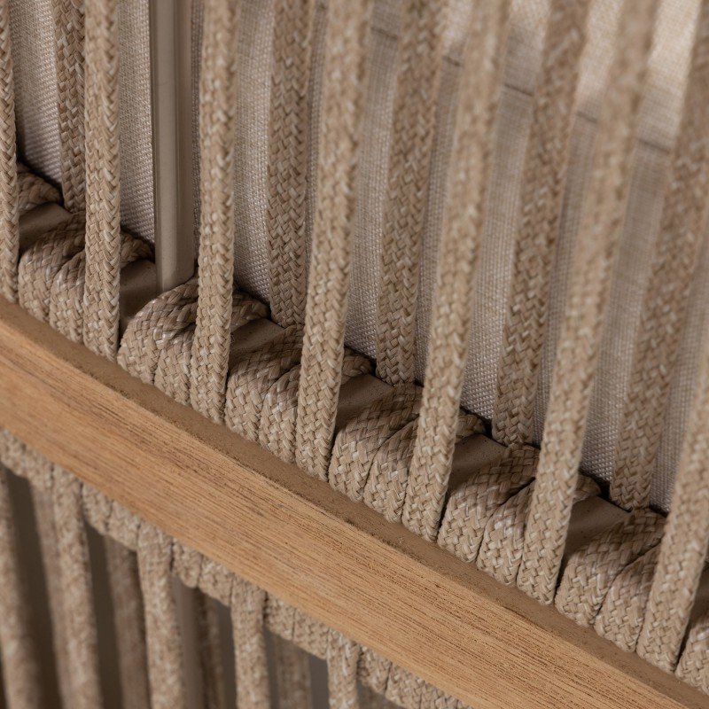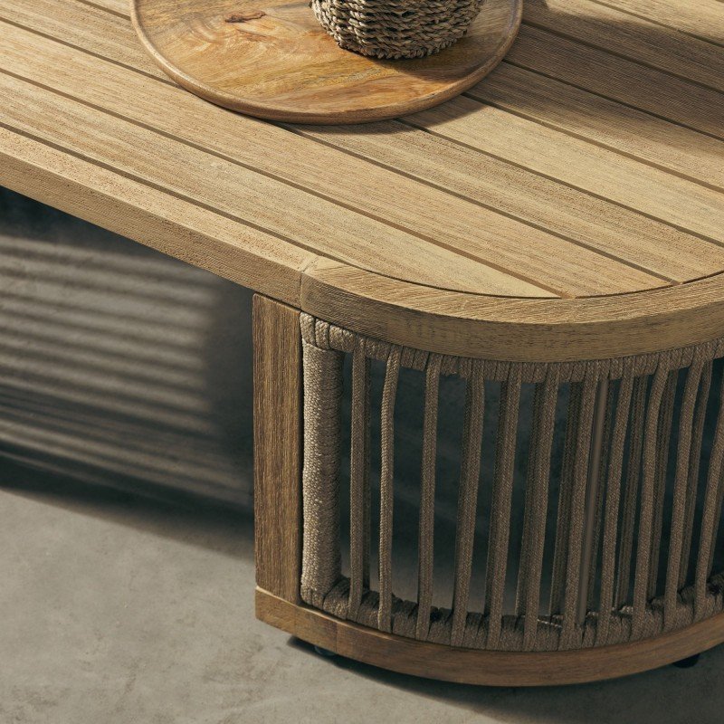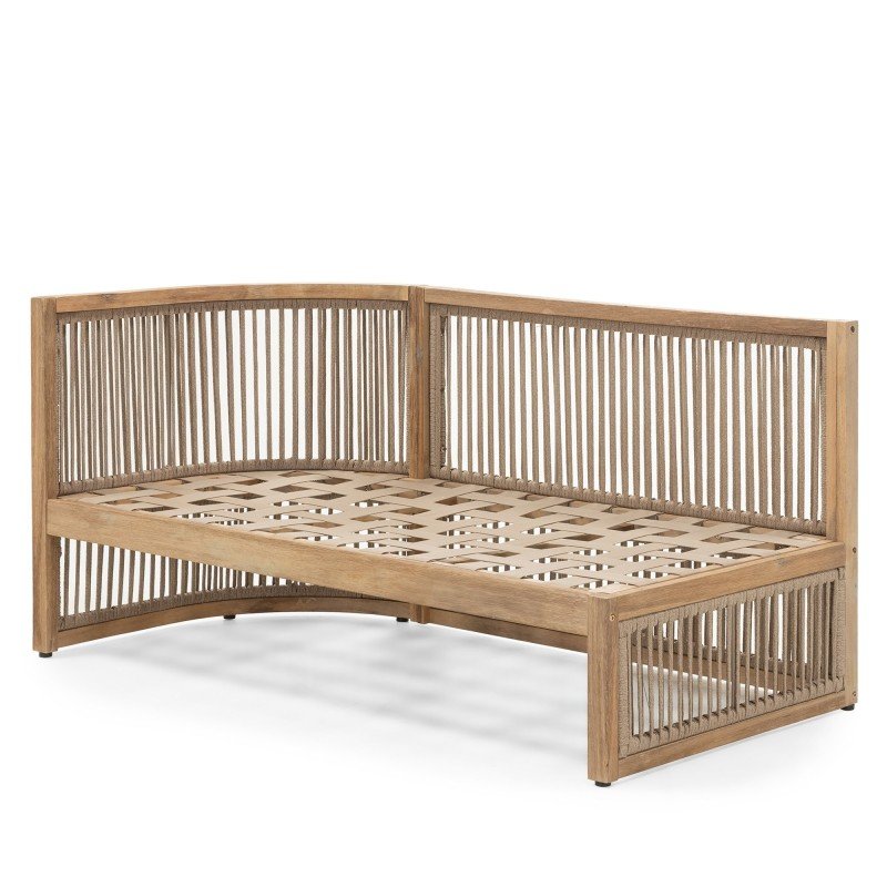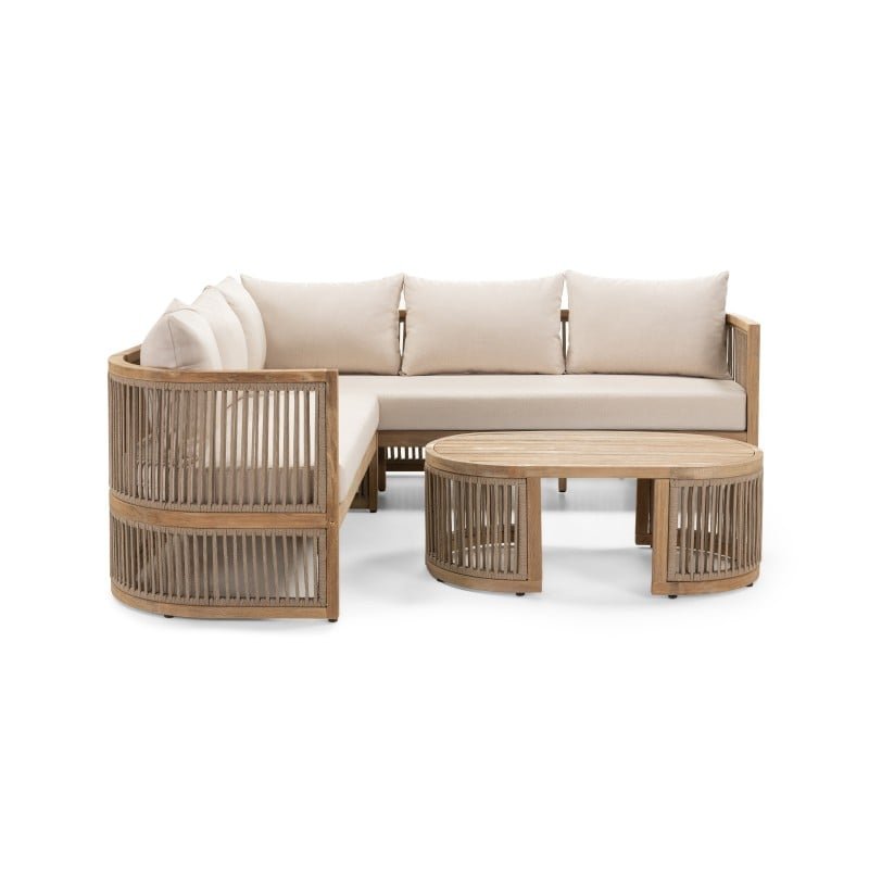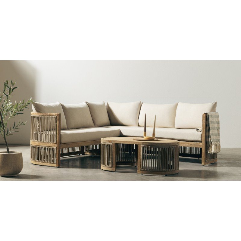 Canapea de colț de grădină Vetralla cu masă, împletitură din răchită, lemn de salcâm FSC, aspect tec, bej deschis, rotunjită